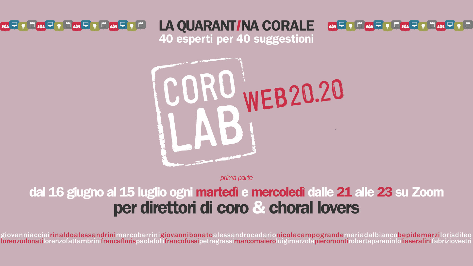 Un percorso formativo articolato in due parti (20+20) e rivolto prevalentemente ai direttori di coro con l'intento di suscitare curiosità, stimolare la fantasia, far conoscere nuove opportunità e scoprire angolature diverse nella pratica della musica corale. Pillole di sapere rese disponibili grazie a direttori, maestri e professionisti di riconosciuto valore che abbinano una grande competenza alla passione che li (e ci) conduce all'arte.